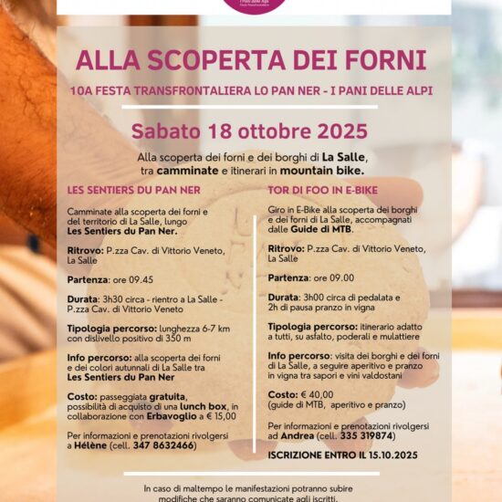 10A FESTA TRANSFRONTALIERA LO PAN NER - I PANI DELLE ALPI Sabato 18 ottobre 2025 ore 09.00: partenza de Lo Tor di Foo in E-Bike in collaborazione con il Velo Club Courmayeur ore 09.45: escursioni alla scoperta dei forni di La Salle in