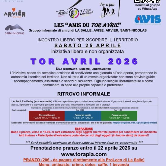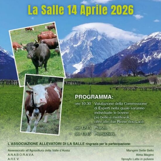La Salle 14 Aprile 2026 Unité des Communes Valdigne Mont-Blanc PROGRAMMA ore 10.30 Valutazione della Commissione di Esperti nella quale saranno individuate le bovine più belle e meritevoli oltre alle due Reine dou Lacê ore 12.15 Pranzo ore 13.15 Premiazioni