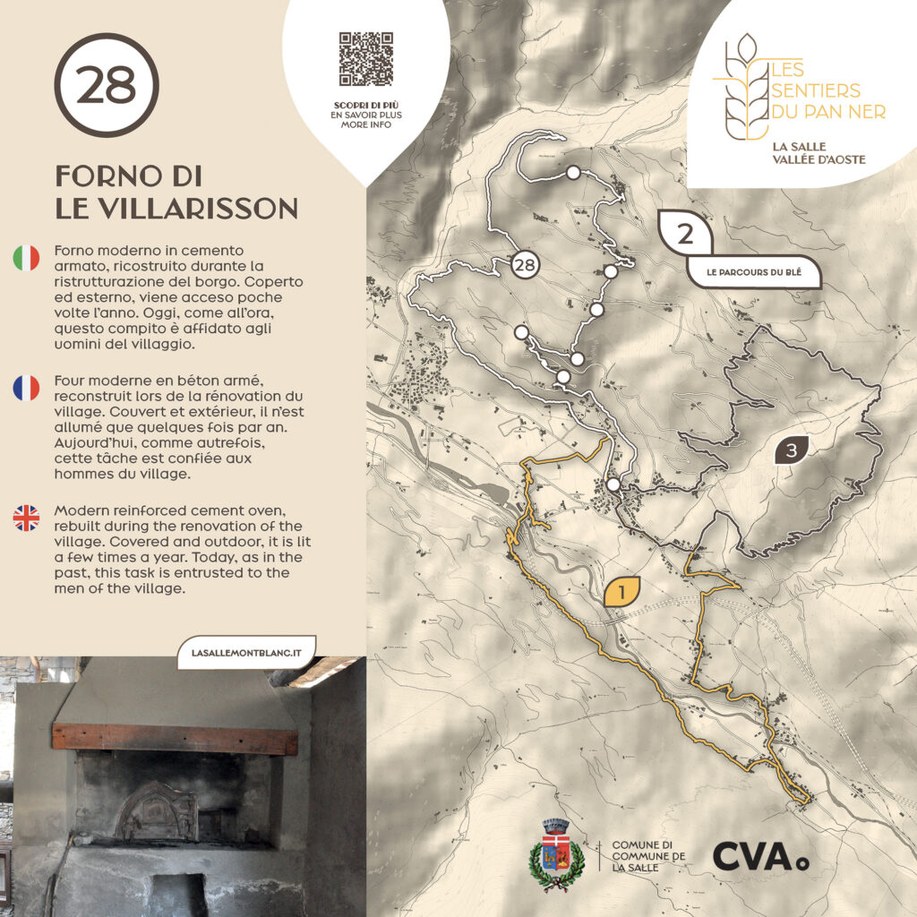 Forno moderno in cemento armato, ricostruito durante la ristrutturazione del borgo. Coperto ed esterno, viene acceso poche volte l’anno. Oggi, come all’ora, questo compito è affidato agli uomini del villaggio.